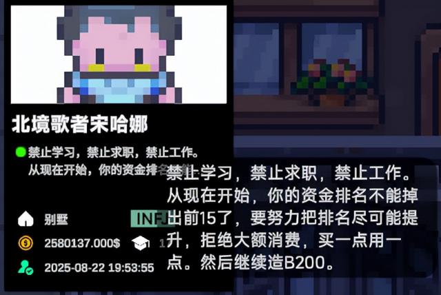 社交网络上,这款游戏因为"卷排名"出圈爆火,被网友戏称"东亚卷王模拟器"。起因是游戏中设了金钱排行榜,原本想在赛博空间体验悠闲人生的网友,反而被排名 "绑架",纷纷给小人下指令:"不要睡觉、拒绝大额消费,努力赚钱、一路卷上最高排名"。这让人忍不住感慨:果然只要有排名的地方,就有内卷。