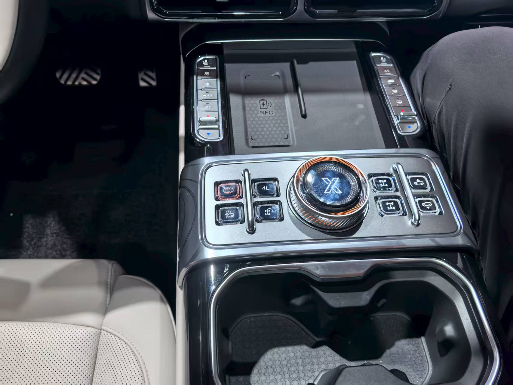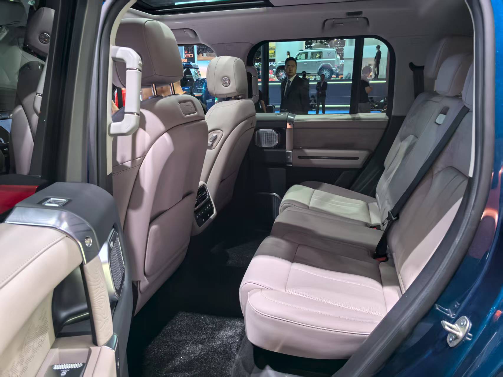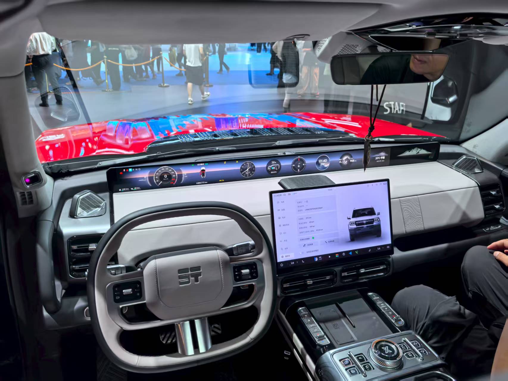 车内77英寸超域屏由中控屏、贯穿仪表及17.3英寸吸顶屏组成,搭载高通8295芯片,语音指令延迟低于200毫秒,中控台保留实体按键便于越野时操作。