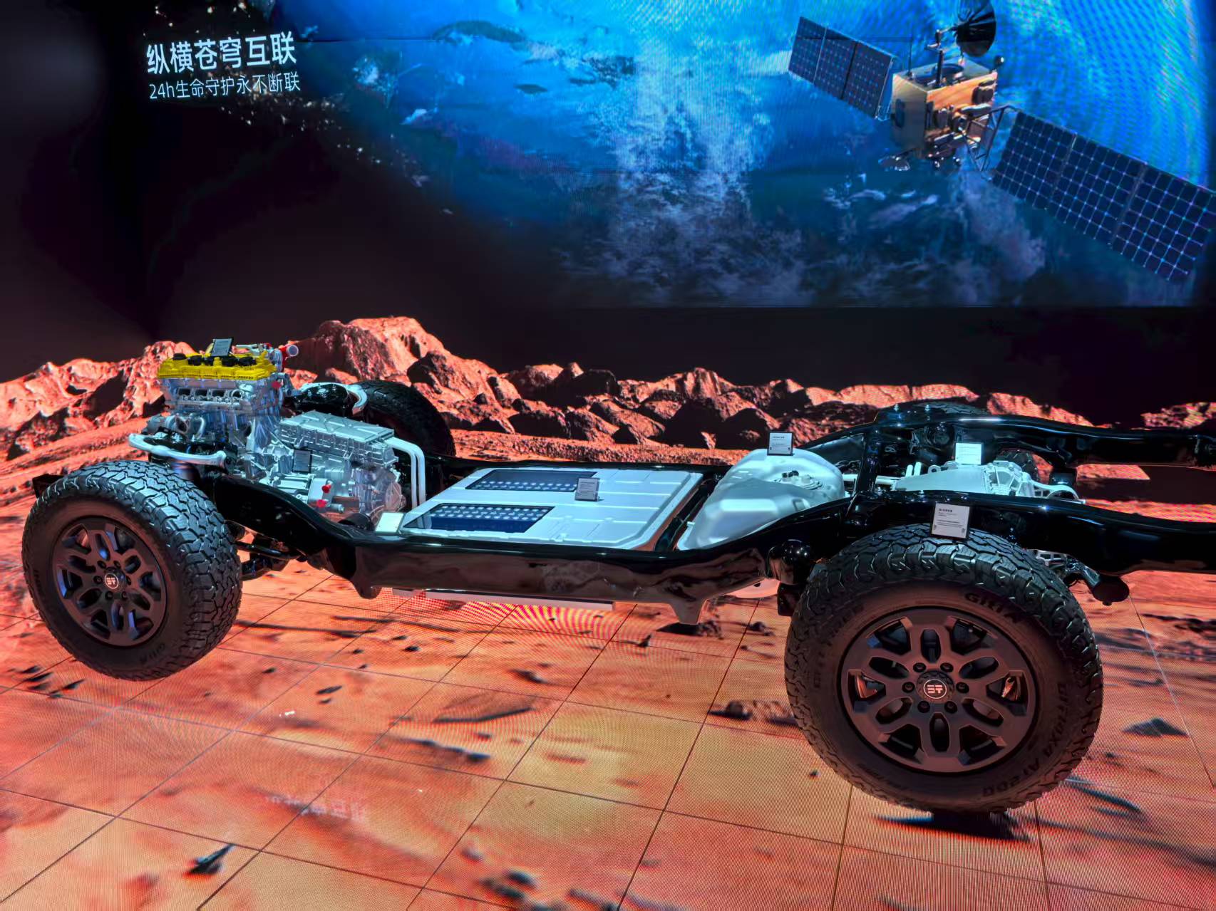 越野配置上,该车采用非承载式车身,配备三把电控差速锁、智能全地形模式、2挡低速四驱系统,接近角30°、离去角25°,涉水深度900mm。选装浮筒套件后涉水可达1米,具备航行能力。空气悬架与 CDC 可调阻尼减振器组合,支持路况预瞄功能,可调整悬挂参数。