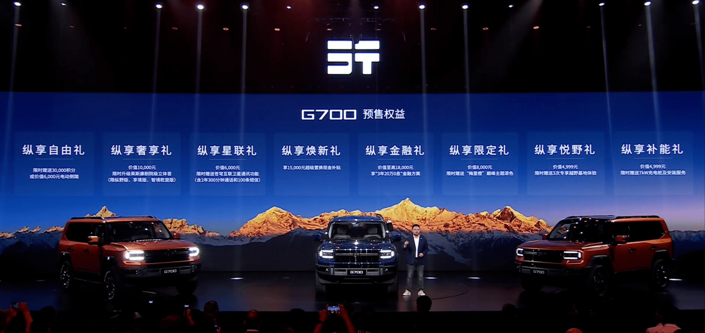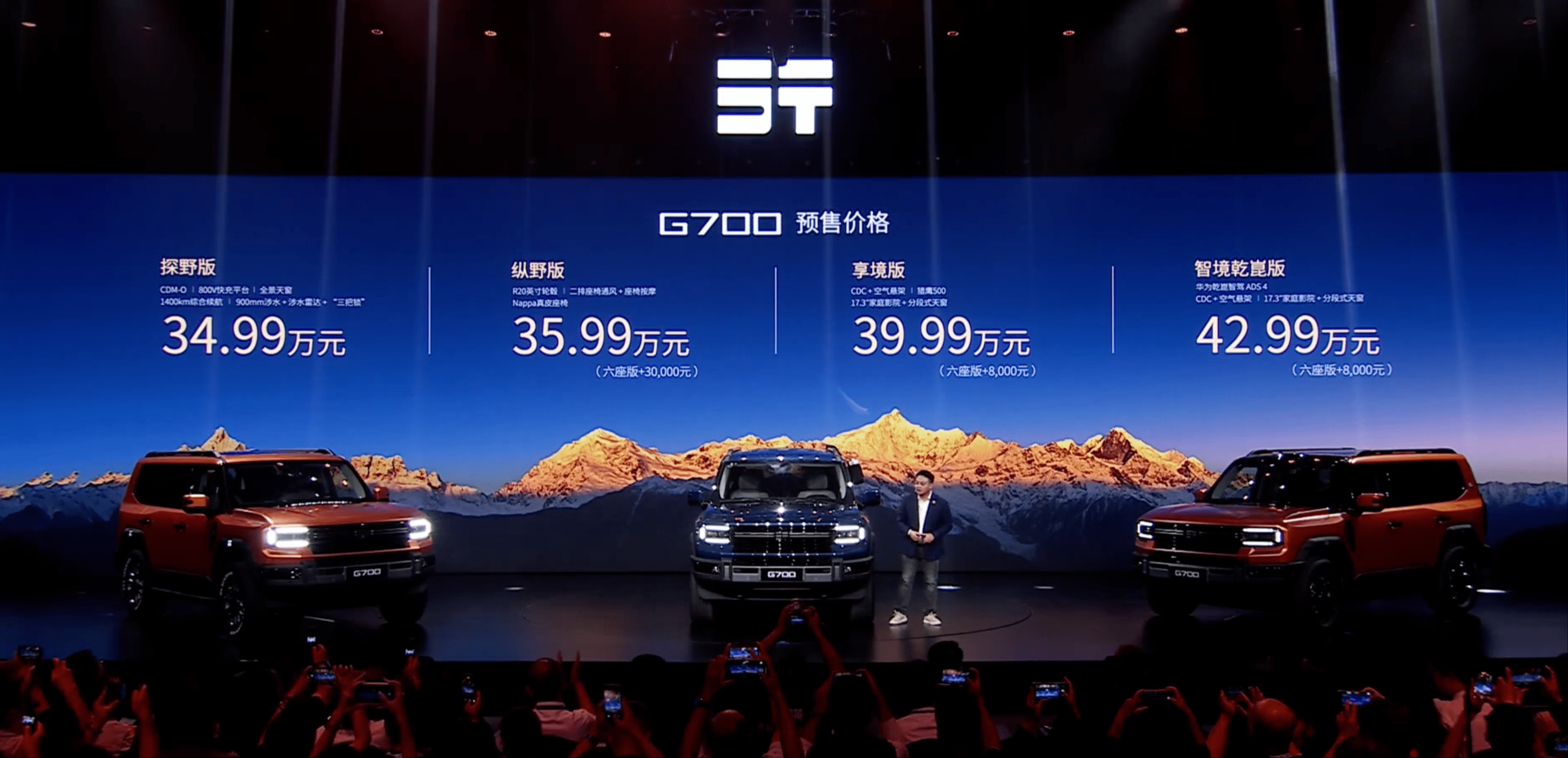 网易汽车9月19日报道 在 “纵横之夜” 发布会上,捷途汽车全新豪华越野序列首款量产车型纵横G700开启预售,预售价34.99-42.99万元。该车以 “全地形 + 全水型 + 苍穹互联” 为技术核心,拥有761马力动力、1400km续航、L2.9级智能驾驶等配置。任意车型置换享受10000元补贴,预售预订送3万积分等好礼。新车将在10月19日正式上市,价格或有惊喜。
