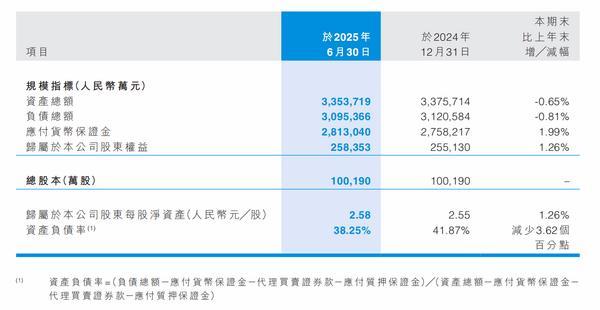 中泰期货表示,截至报告期末,本集团资产总额为人民币335.37亿元,较2024年末的人民币337.57亿元下降0.65%。本集团负债总额为人民币309.54亿元,较2024年末的人民币312.06亿元下降0.81%。归属于本公司股东权益为人民币25.84亿元,较2024年末的人民币25.51亿元增长1.26%。本集团资产负债率(其中资产总额与负债总额均扣除应付货币保证金、代理买卖证券款和应付质押保证金)为38.25%,较2024年末的41.87%减少3.62个百分点。报告期内,本集团资产优良、财务状况良好。