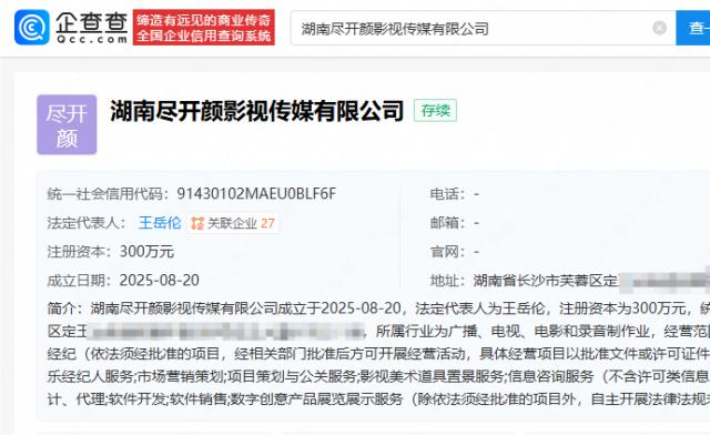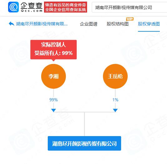 企查查 APP 显示,近日,湖南尽开颜影视传媒有限公司成立,注册资本 300 万元。在该公司中,李湘持有 99% 股权,王岳伦持有 1% 股权并担任法定代表人、执行公司事务的董事、经理职务。