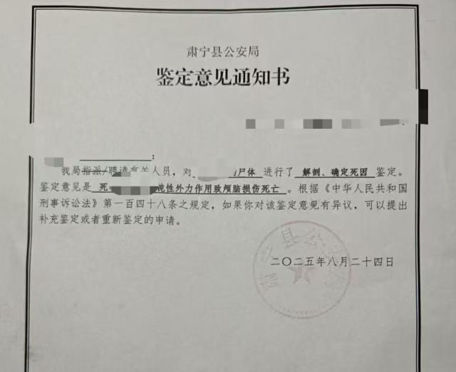 8 月 24 日,肃宁县公安局出具鉴定意见通知书,称死者系钝性外力作用致颅脑损伤死亡。